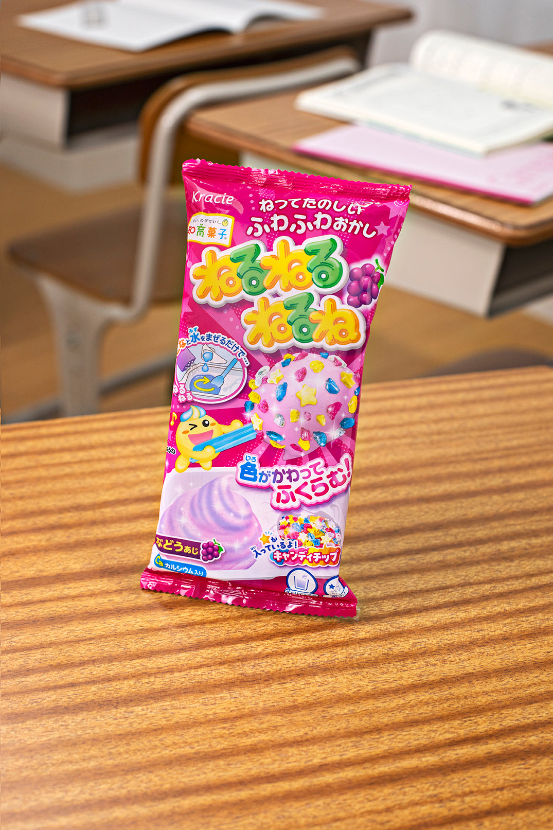 Nerunerunerune Grape Candy Kit is an exciting interactive treat that transforms with a splash of water. As you mix the powder with water, watch as the candy changes color and expands into a fluffy delight with a refreshing grape flavor loved by kids. Continue the fun by topping the treat with star-shaped marzipan candy chips that add a delightful crunch to the soft Nerunerunerune candy.